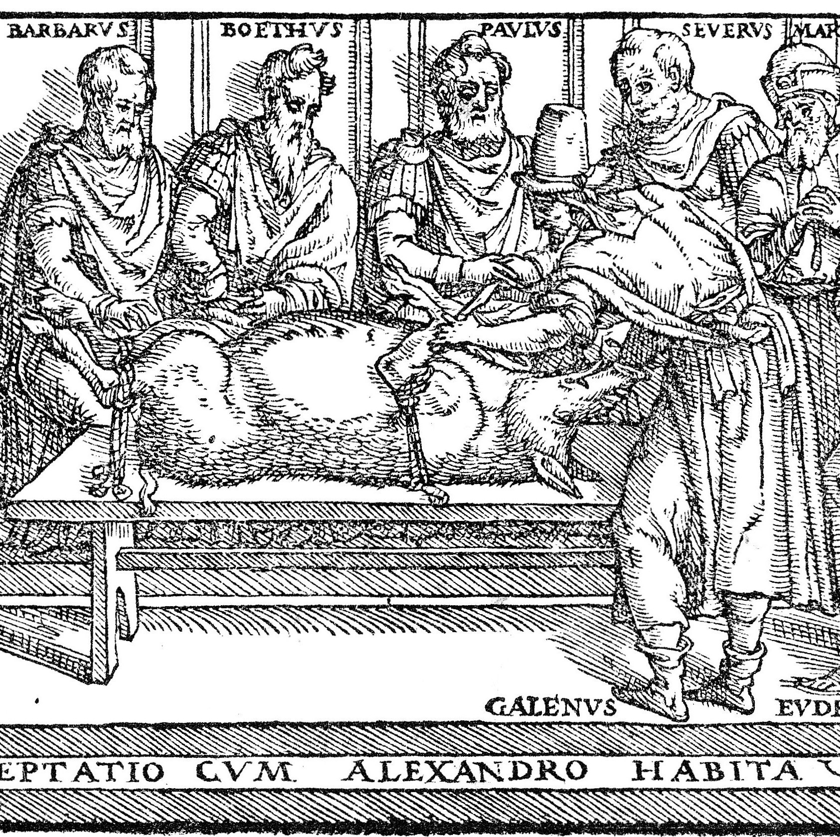 Galen, the Greek physician who lived around 200 AD, is considered a key figure in experimental medicine. He studied anatomy by dissecting and vivisecting animals, and his experiments took the form of applying various surgical techniques to animals and seeing what happened. For example, consider his research on arteries. When you dissect a dead animal, you find that the arteries are mostly empty (because the blood has drained out), so people believed that the arteries were a system of tubes for conveying inhaled air to the rest of the body. They realized that when you cut the artery of a living animal, it bleeds, but they theorized that this was because the cut lets the air out of the artery, and then blood rushes in. Galen’s experiment was to expose a length of artery in a living animal, tie ligatures in two places, and then open the artery in between. There was, of course, already blood in this isolated section of artery.