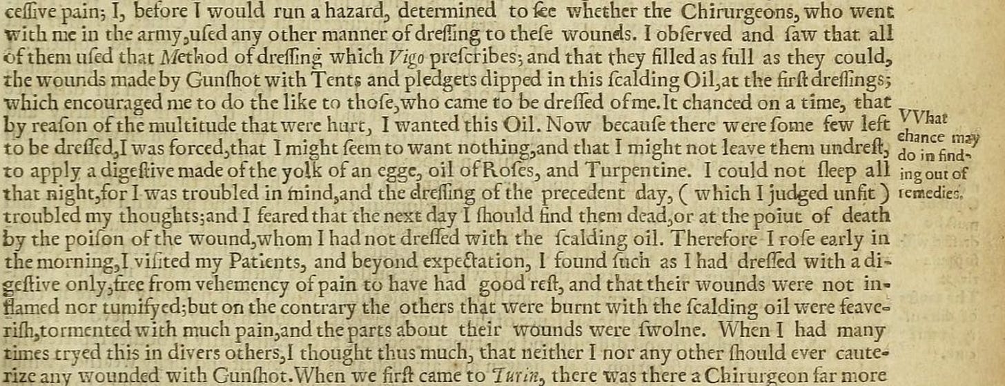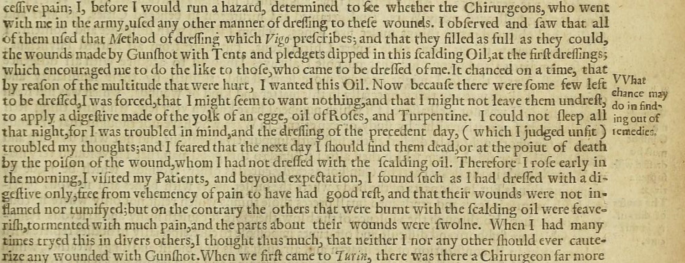 Paré didn’t set out to do a controlled trial, but apparently the results of running out of oil were so clear, dramatic, and unexpected that he took the findings to heart. He may also have picked up the idea of a controlled trial more generally, because elsewhere he describes a deliberate within-subject trial of treating burns with onion paste: “I applied onions to one half of his face and the usual remedies to the other. At the second dressing I found the side where I had applied the onions to have no blisters nor scarring and the other side to be all blistered; and so I planned to write about the effects of these onions.”
